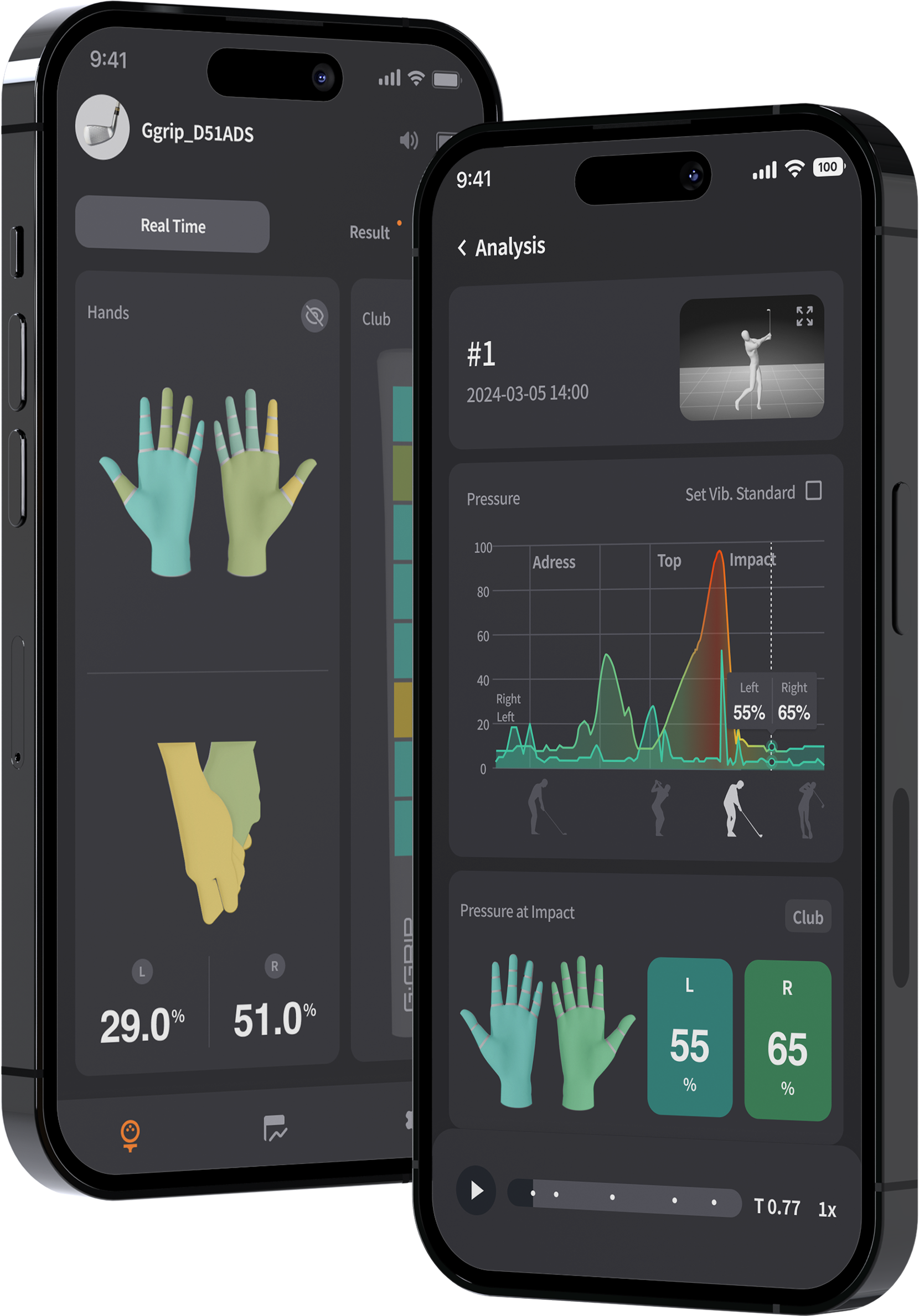 Guided calibration personalizes left- and right-hand pressure to your swing.